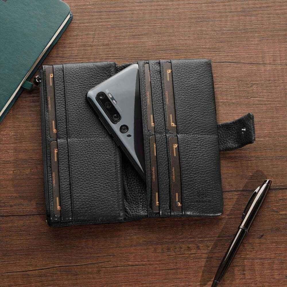 - تتسع هذه المحفظة لـ 20 بطاقة صراف آلي، بالإضافة إلى جيب للعملة الورقية وجيب للجوال.